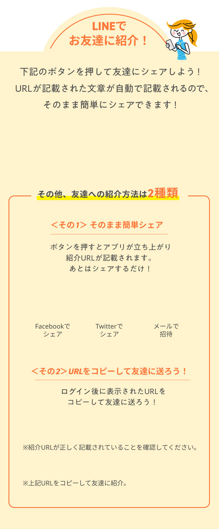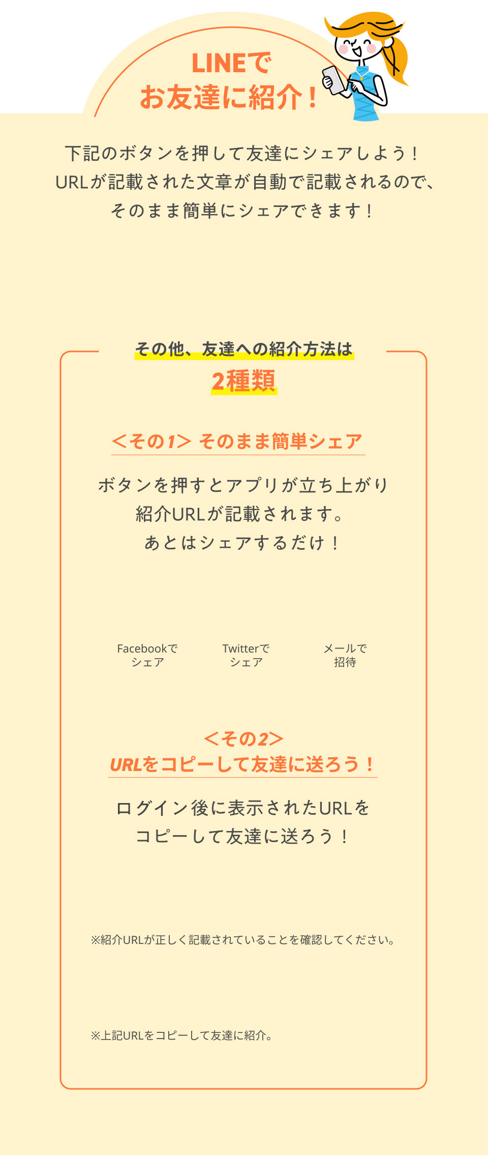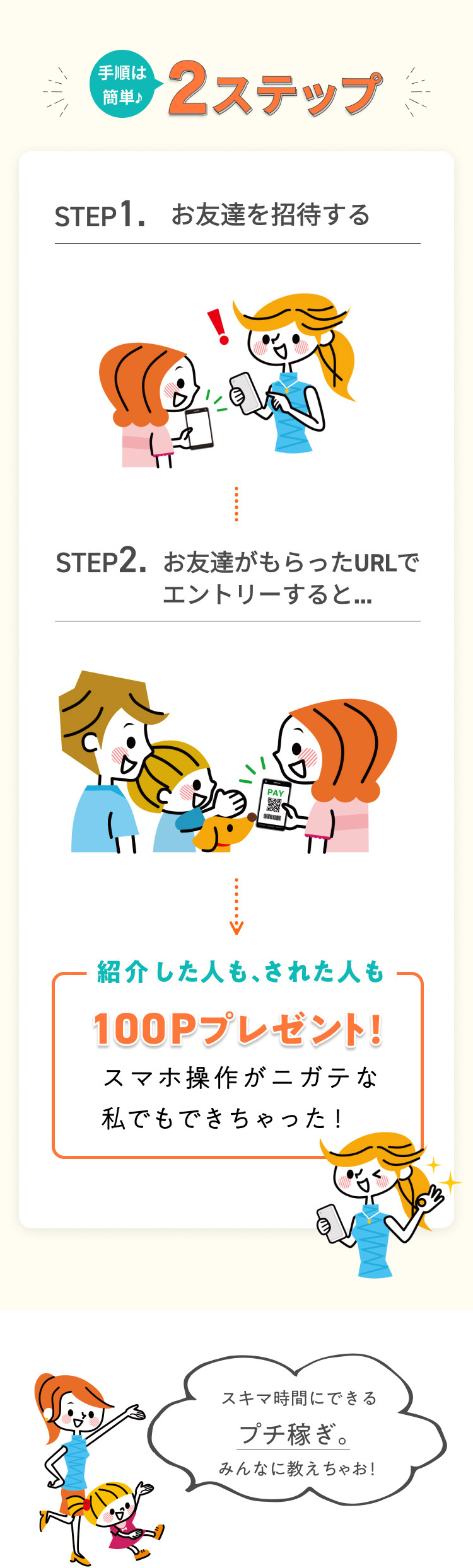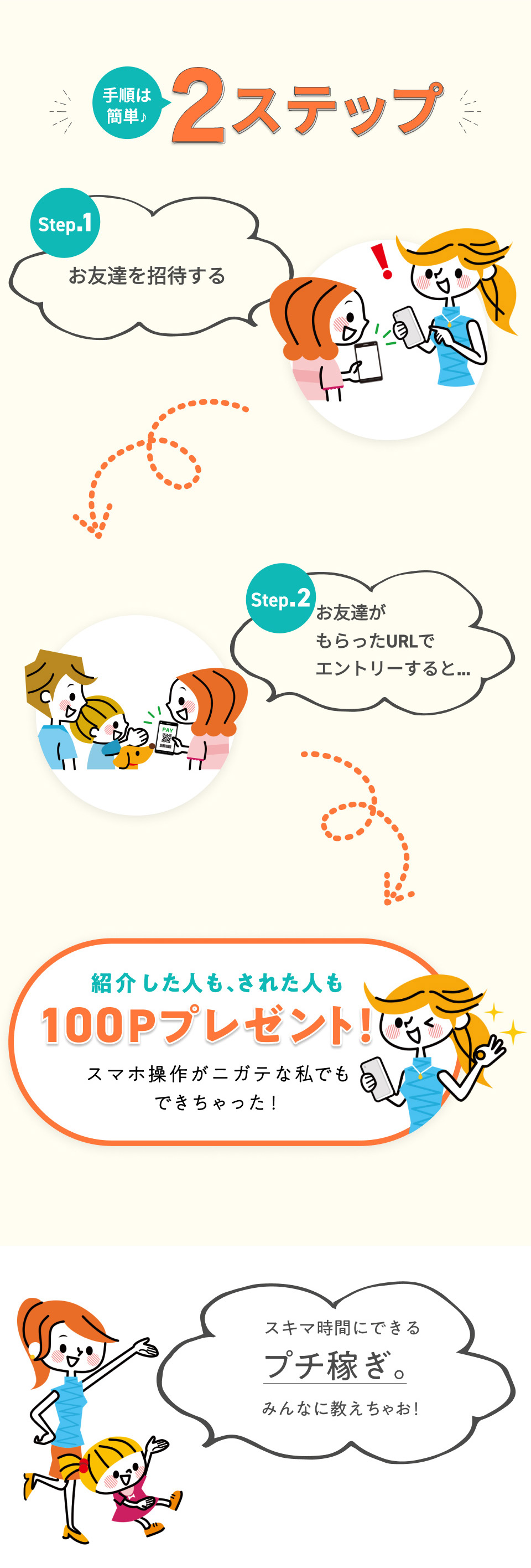 ご紹介いただいたお友達がdジョブ スマホワークに利用登録(無料)いただくと、ご紹介者とお友達それぞれにdポイント100Pをプレゼント!
