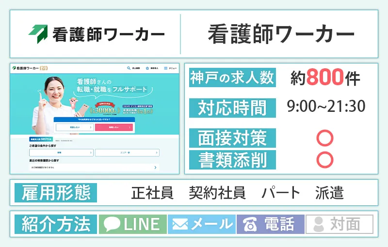 神戸市内に拠点はないものの、オンラインで書類添削や面接対策など行ってくれるので、転職経験が浅い20代~30代の看護師にもおすすめです。